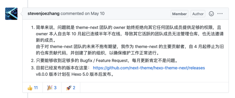 现在主要贡献者竟然另建了一个项目,从v8.0开始另起炉灶,似乎有点不比寻常。翻了翻大神的博客,竟然没有提到片语,查看项目的Issue讨论区,终于发现了端倪: