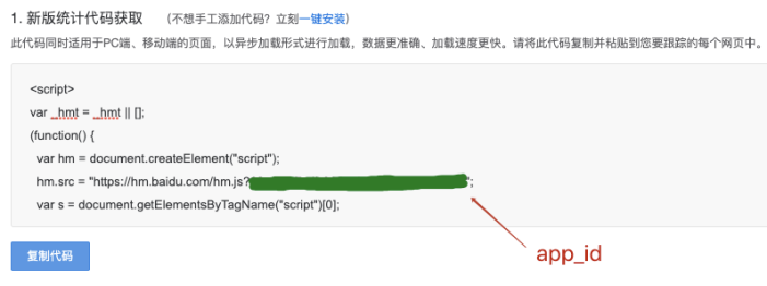 这个app_id可以从百度统计给的安装代码中获取:注册登录https://tongji.baidu.com/,找到网站统计 -> 账户管理 -> 代码获取,在