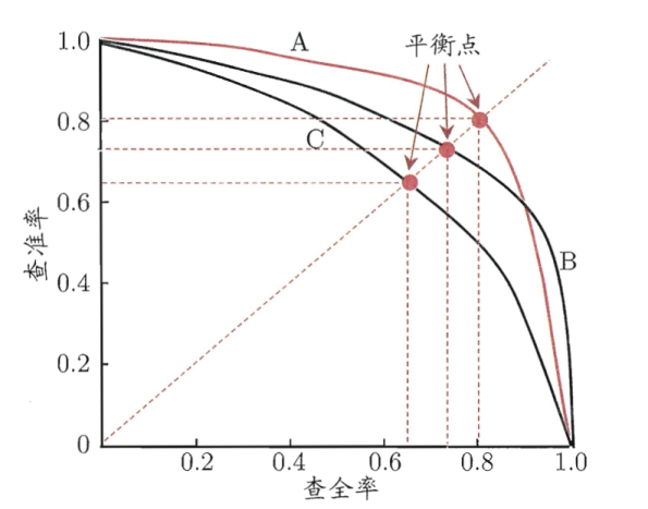 P-R曲线直观的显示出一个算法在样本总体上的查全率、查准率情况。如果一个算法的P-R曲线被另一个算法的曲线完全包住,则可断言后者优于前者。但是实际中,经常不同算法的P-R曲线是互相交叉的,这时就很难直观判断出两者的优劣。这时通常会考察平衡点(BEP)、F1度量、AP等指标。